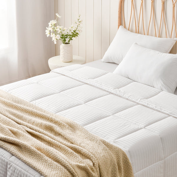 Filled with 500GSM Australian wool, it’s superbly soft, naturally insulating and moisture-wicking - keeping you warm without overheating. Encased in a premium cotton sateen stripe cover and finished with elegant satin piped edging, this quilt embodies Onkaparinga’s long-standing reputation for craftsmanship and quality since 1869.